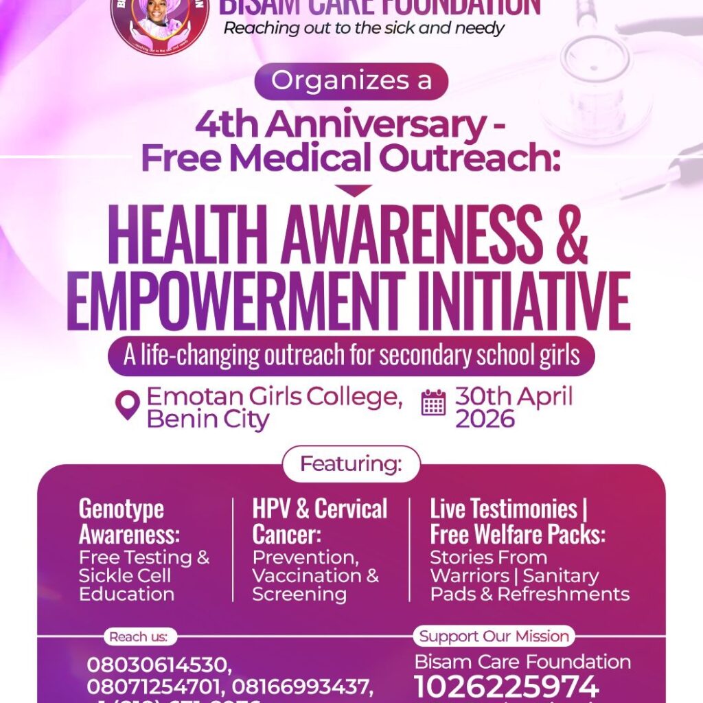 In commemoration of the 4th anniversary of the passing of Late Mrs. Olabisi Osagie, the BISAM Care Foundation is organizing its annual health and empowerment initiative to take place on April 30, 2026.