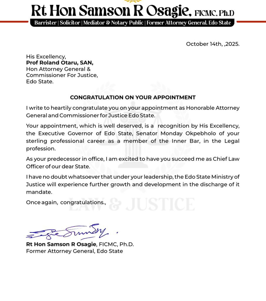 Dr Samson Osagie Congratulates Prof Roland Otaru as Edo Attorney General October 14, 2025 by Iconic News Team with no comment General News Previous Post SPEECH DELIVERED BY THE HONOURABLE ATTORNEY-GENERAL ANDCOMMISSIONER FOR JUSTICE, EDO STATE, RT. HON. SAMSON R.OSAGIE, FICMC, Ph.D AT THE SPECIAL COURT SESSION MARKING THEOPENING OF THE 2025/2026 LEGAL YEAR OF THE EDO STATEJUDICIARY, HELD ON FRIDAY, 10TH OCTOBER, 2025, AT THE CEREMONIAL HALL, NEW HIGH COURT COMPLEX, SAPELE ROAD,BENIN CITY. Next Post Ode to a Legacy and Model of True Leadership