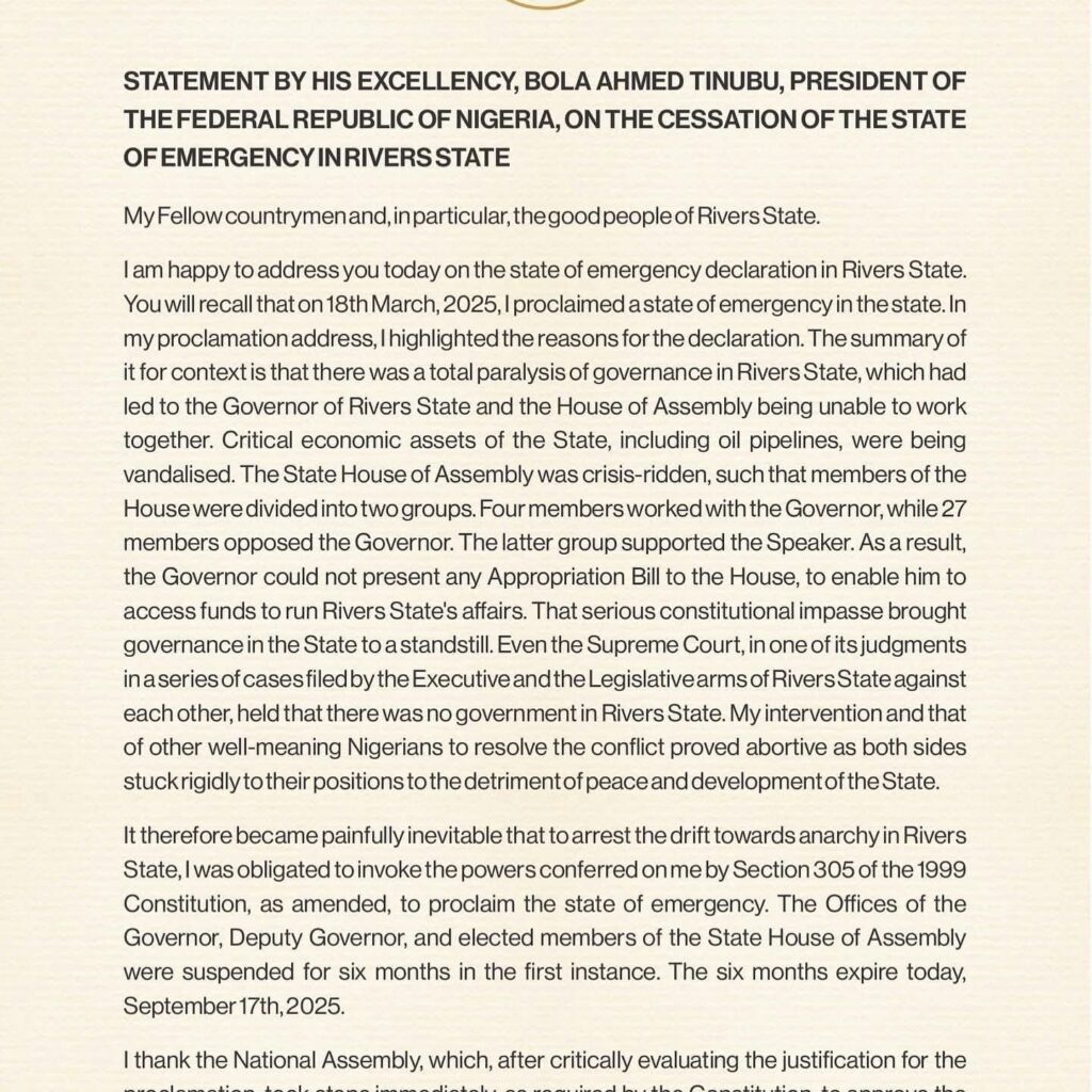 President Bola Tinubu has lifted the six-month state of emergency in Rivers State, effective midnight, September 17, 2025.