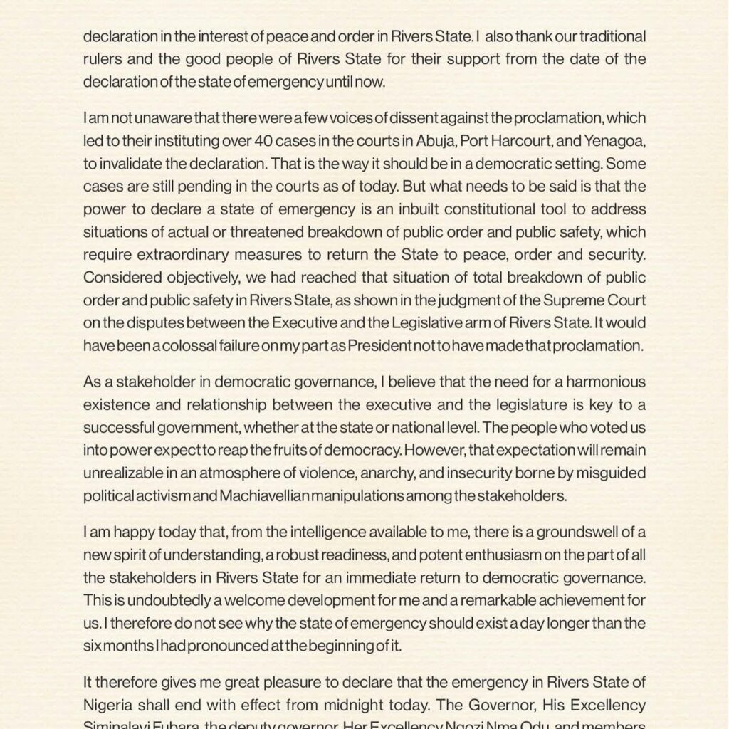 He also thanked the National Assembly for approving the emergency declaration and the traditional rulers and people of Rivers State for their support during the crisis. He further urged governors and lawmakers across the country to prioritize collaboration and peace to ensure the delivery of democracy’s benefits to the people.